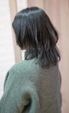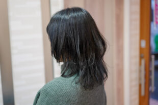 ダークシルバーで落ち着いた色味ながら、外はねの動きで軽やかさをプラスしたミディアムスタイル。柔らかい質感で大人のクールさを演出します。