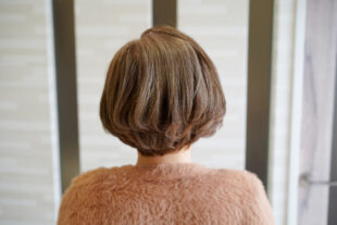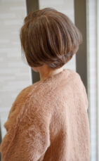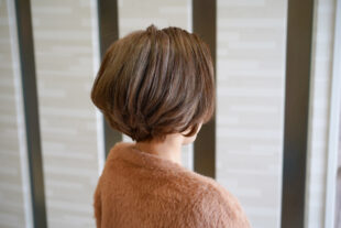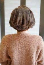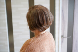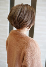 ミルクティーブラウンで白髪を自然にぼかし、柔らかな透明感とツヤをプラス。後頭部に丸みを持たせたシルエットで、上品さと女性らしさを引き立てる大人ショートスタイル。