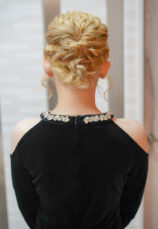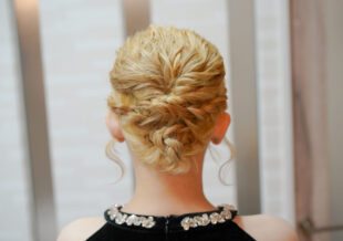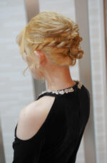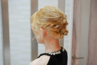 サイドに編み込みを入れながら、全体をねじりでまとめた上品なアップスタイル。