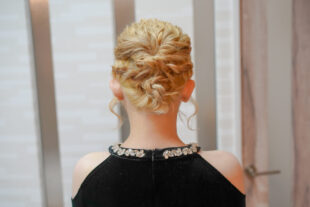 顔まわりの後れ毛は柔らかくカールをつけ、女性らしさを引き立てる仕上がりに。