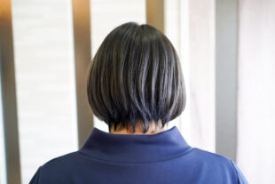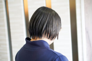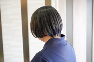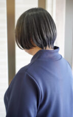 透明感のあるアッシュ系カラーが、レイヤーの動きをより立体的に見せる最旬ショートボブ。光に当たるたびに柔らかなグレーとブルーのニュアンスが揺れ、髪そのものの質感を美しく際立たせる仕上がり。襟足はタイトに、トップは軽やかに動くよう計算されたシルエットで、色とカットの相乗効果が最大限に生きるデザイン。