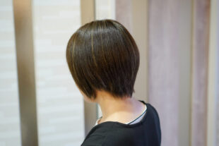 デザインのポイントは、細かく入れたハイライトを活用した「白髪ぼかし」です。白髪を染めるのではなく、明るいハイライトと馴染ませることで、伸びてきても白髪が目立ちにくくなります。また、髪の表面に繊細なスジ感が生まれ、立体感とツヤ感が大幅にアップします。