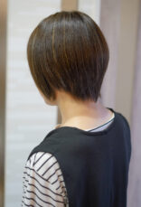 後頭部の丸みを美しく、襟足をすっきりとタイトにまとめた洗練されたシルエットです。全体に計算されたレイヤーを入れることで、軽やかな動きと、トップの自然なボリュームを引き出しています。